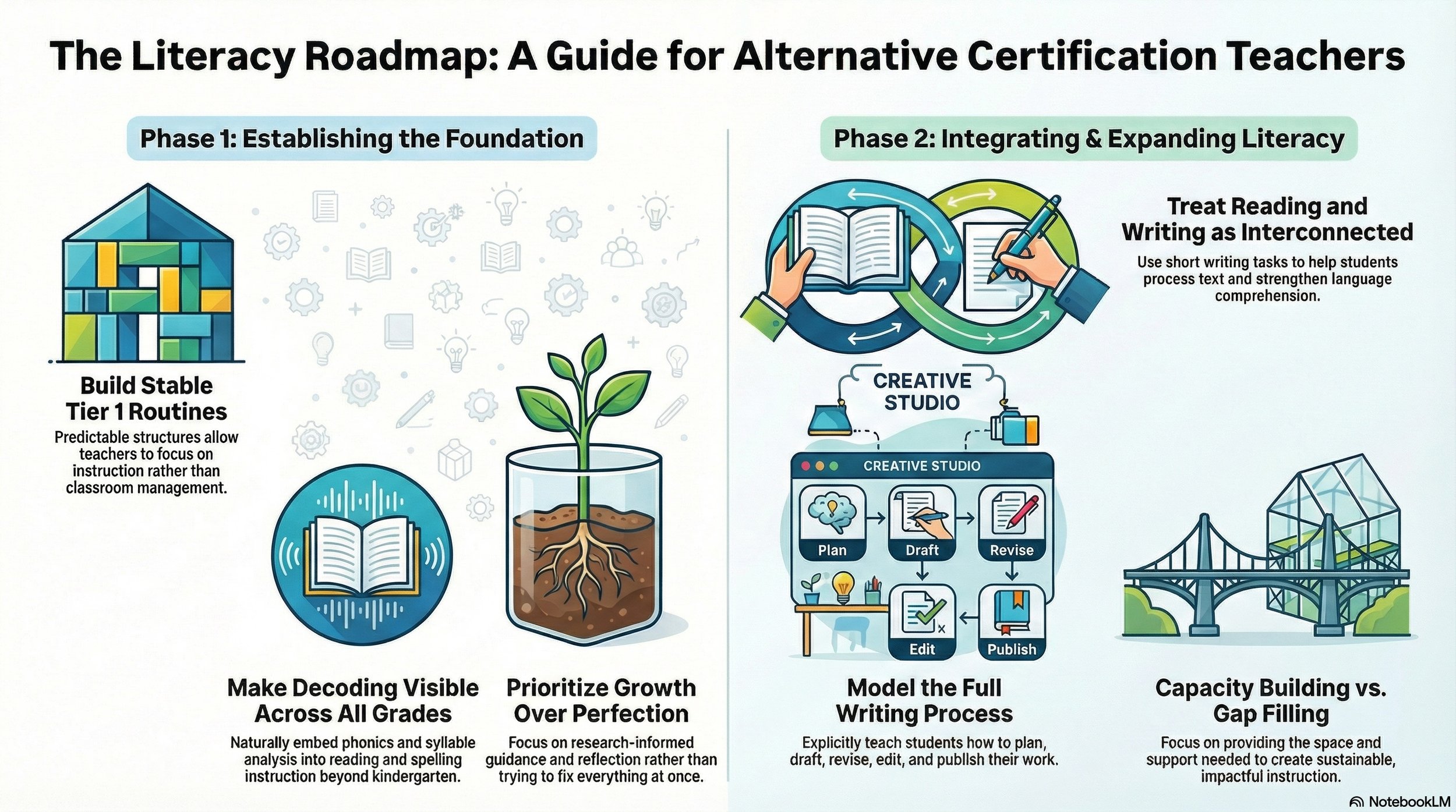 Rather than trying to implement every strategy at once, alternative certification teachers benefit most from viewing literacy instruction as a roadmap. Establish routines first. Teach reading and writing in connected ways. Make decoding visible. Build writing instruction intentionally over time. These priorities create a strong foundation that can be refined and expanded as teachers gain experience and confidence.